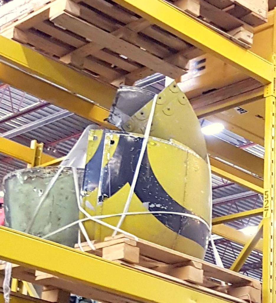 A closer investigation of the pallet holding the parts revealed a label indicating “Cowlings DC-3?”. They obviously were too small to be DC-3 parts but they were Cessna Crane, and complete with the pale yellow and black scheme seen in the image. Encouraged I took a good look through the warehouse and found even more of BTG. Amongst the loose panels in an uncatalogued parts area I found two lower nacelles and two engine accessory panels, all from a Crane with the same paint scheme.