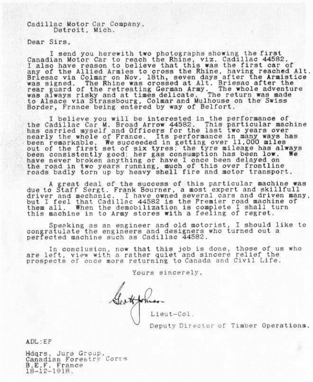 A letter from Lt. Col. George H. Johnson Canadian Forestry Corps to the Cadillac Motor Car Company dated December 1918 praising the Cadillac cars supplied to Canada during the war. (Cadillac Motor Car Company)
