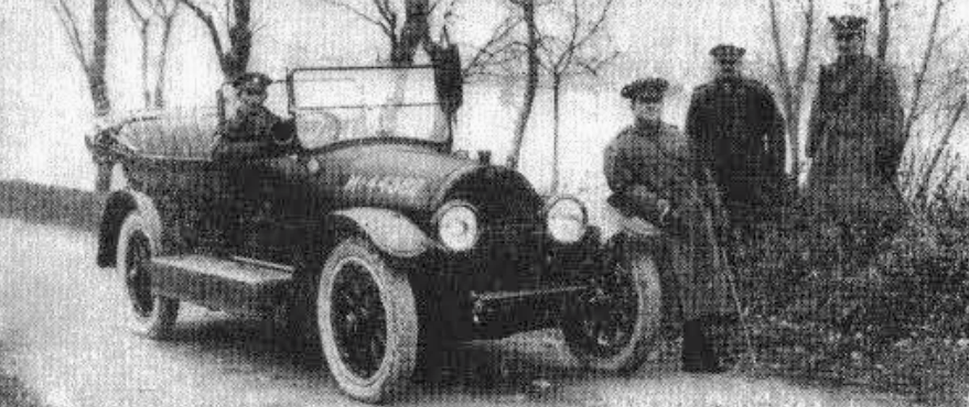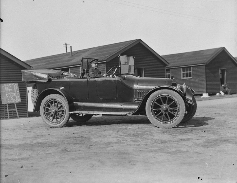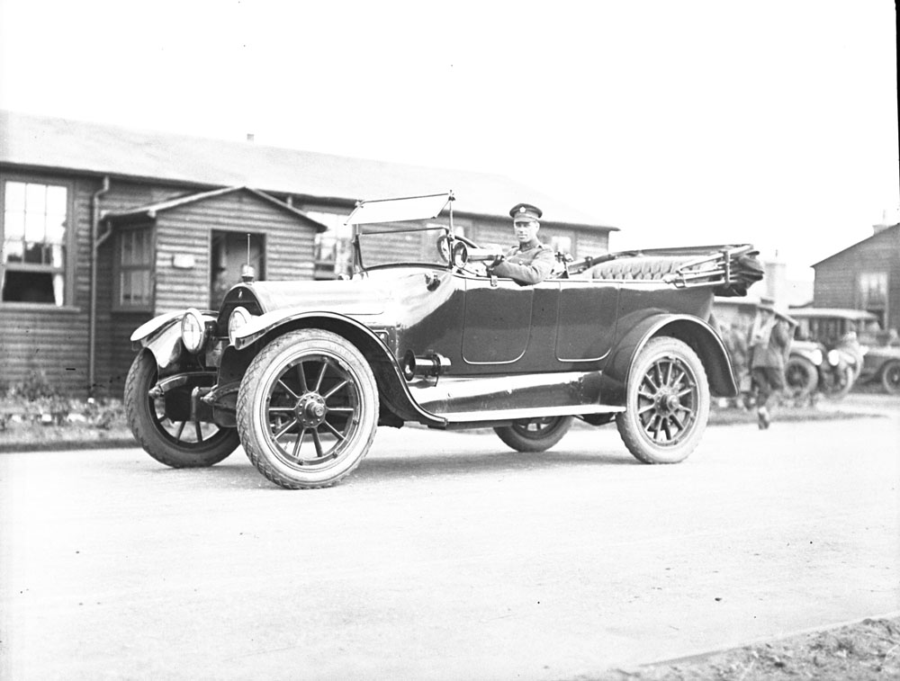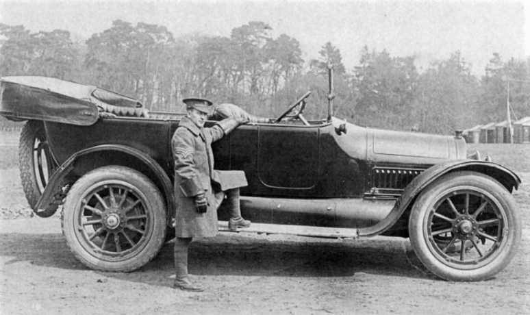 A 1916 Type 53 staff car, seen at Whitley Camp, England, driven by Sgt. W.A. Corbett. Note the Pennant staff on the radiator cap and large horn mounted on drivers door. (Library and Archives Canada)