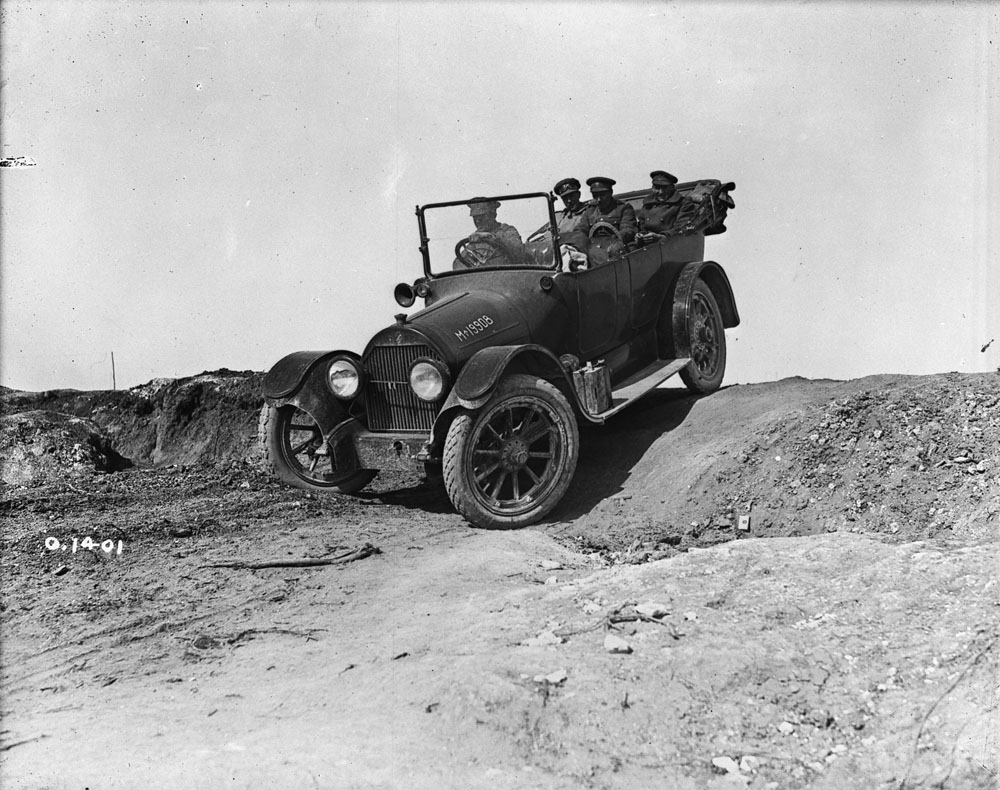 M19908 a 1916, Type 53, passing over the old German front line on Vimy Ridge, France. May, 1917 Note the Petrol/Oil /Water can secured to the running board. (Library and Archives Canada)