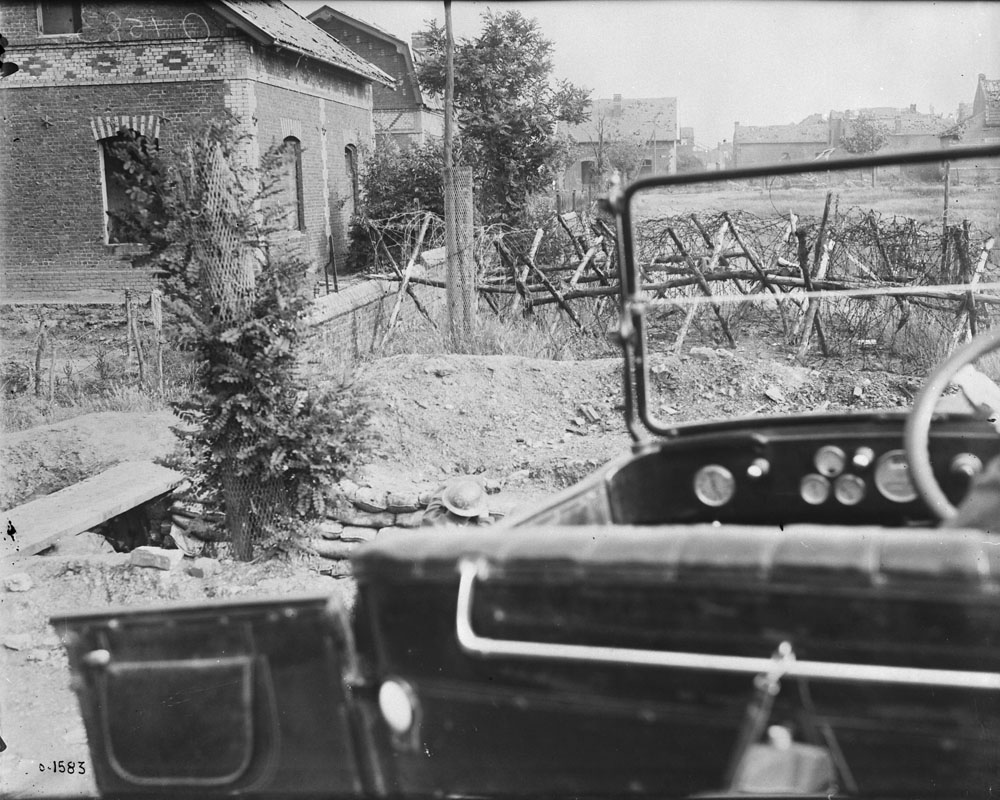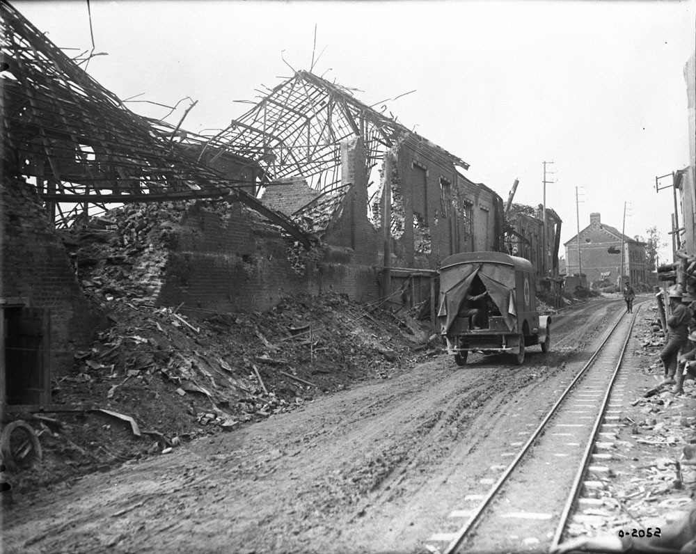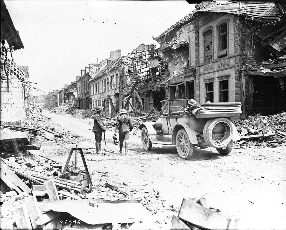 A dusty Cadillac on the main street of Lievin, on the outskirts for Lens, France. By the shorts and helmets in wear the Date would suggest summer, 1917.