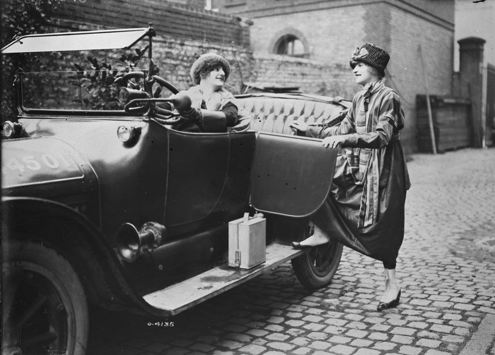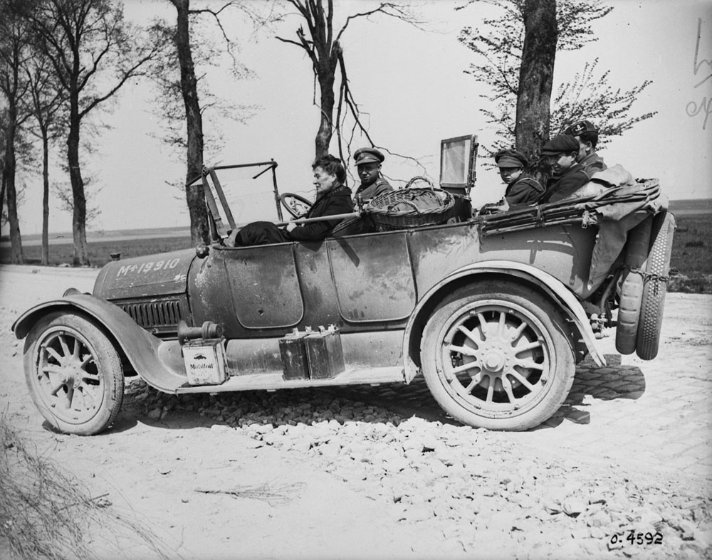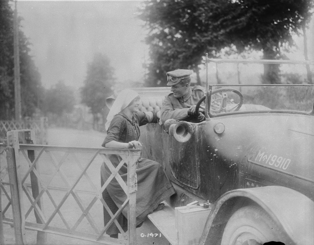 M19910, a 1916 Type 53 assigned to the Canadian War Records Office photographer. Here the driver is seen chatting up a nurse at a railroad crossing in June 1917. (Library and Archives Canada)