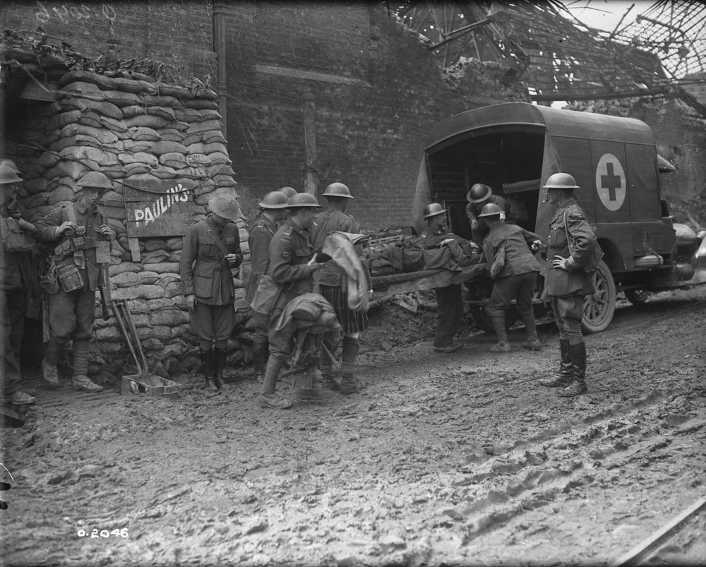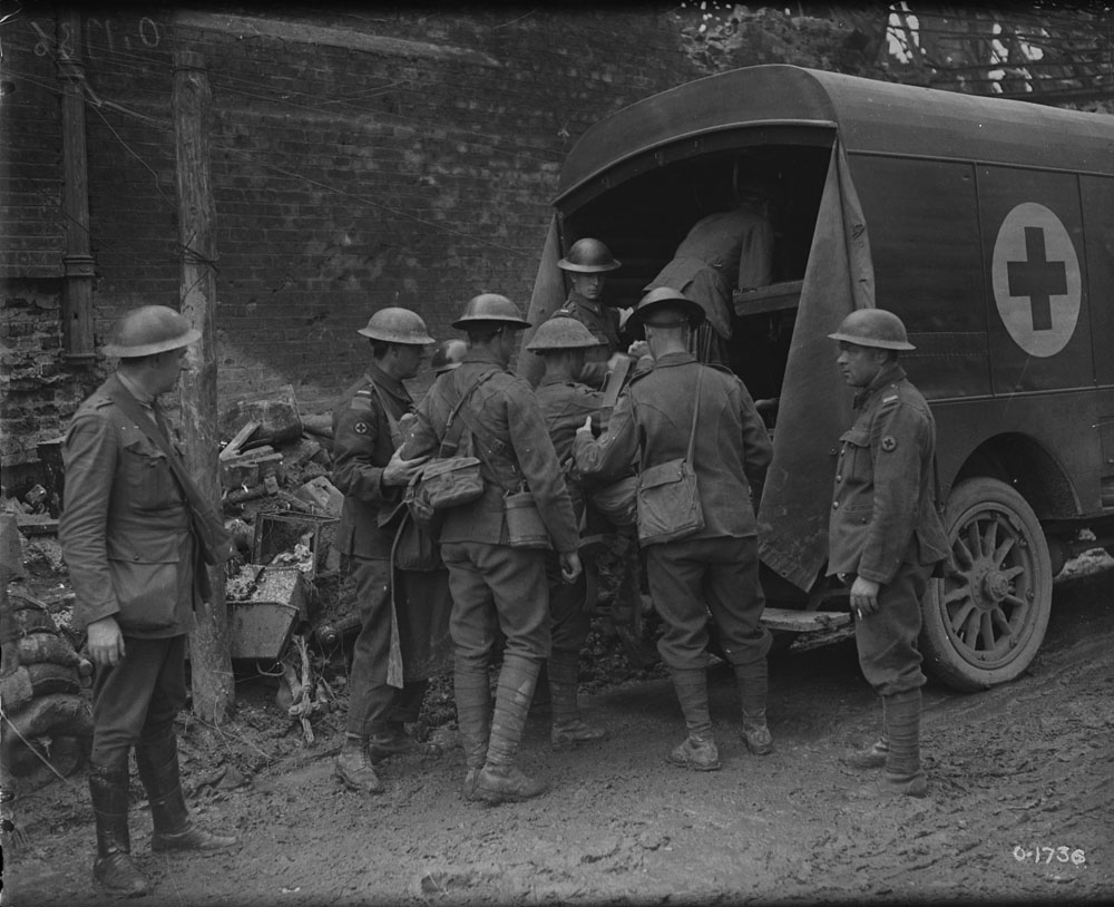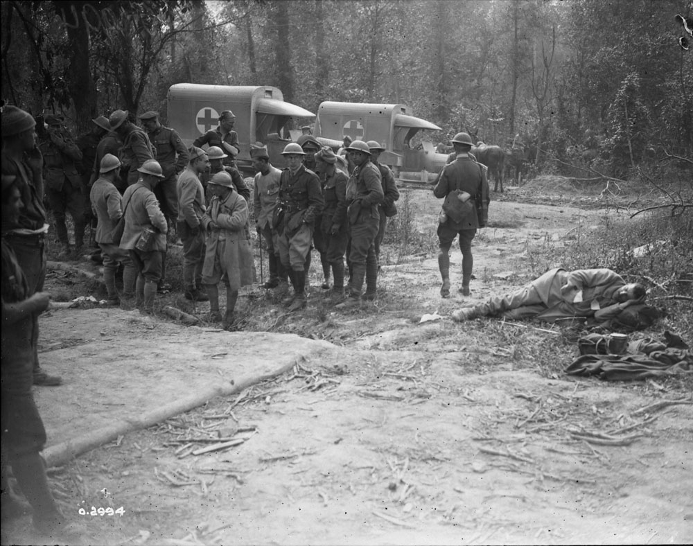 Two Cadillac ambulances seen at a Field Ambulance Dressing Station during the Battle of Amiens. August, 1918 (Library and Archives Canada)