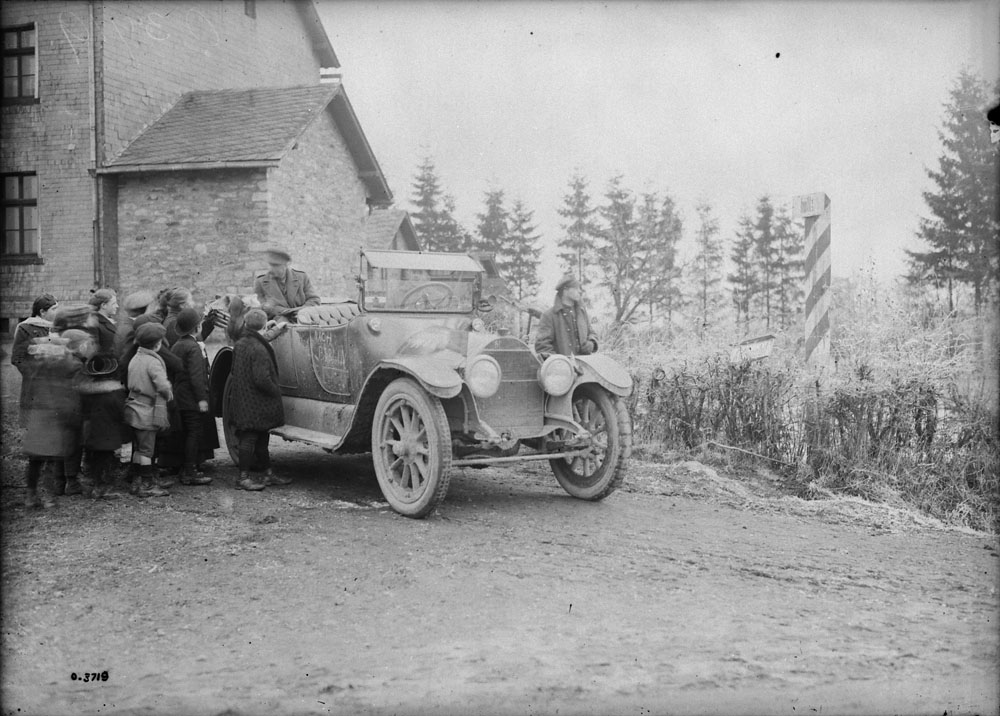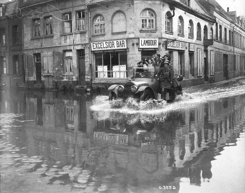 A well loaded Cadillac carrying civilians returning to their homes through flooded streets of Valenciennes, France, November, 1918. (Library and Archives Canada)