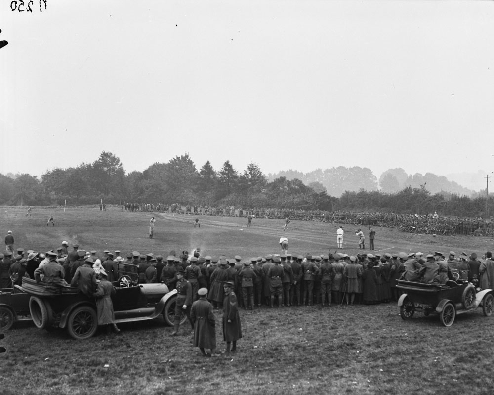 A Cadillac and a pair of Ford Model “T”‘s at a baseball match between the Epsom Canadians and the 198th Battalion CEF at Godalming, Surrey in October 1917. (Library and Archives Canada)