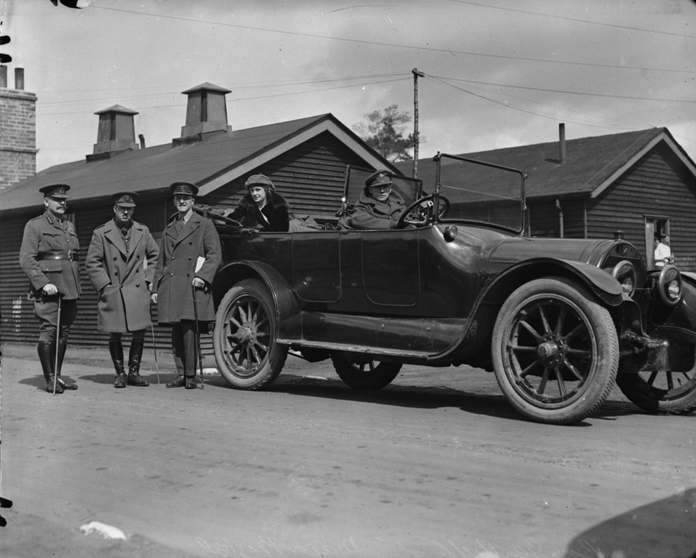 The 1916 Type 53 staff car of Brig.-Gen. AH Bell, CMG, DSO (standing right) seen in England. (library and Archives Canada)