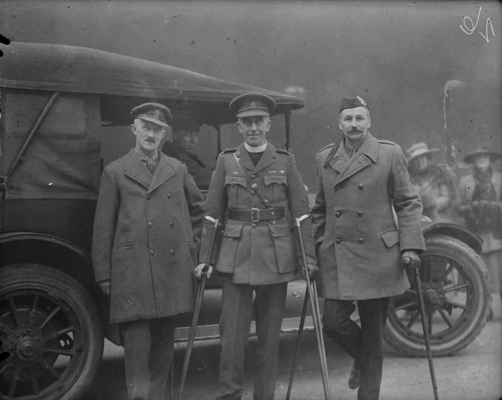 Maj. A.M. Gordon, D.S.O., Lt Col. F. Scott, D.S.O. Maj E.E. Graham, D.S.O., M.C, standing in front of a Canadian Cadillac in London, England in 1919. This images shows a car with the top and partial side curtains fitted. (Library and Archives Canada)