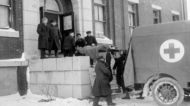 Unloading a casualty from the Halifax Explosion from the back of a Cadillac ambulance fitted with tire chains for winter traction in Halifax, Nova Scotia, December 1917. (Canadian Red Cross)