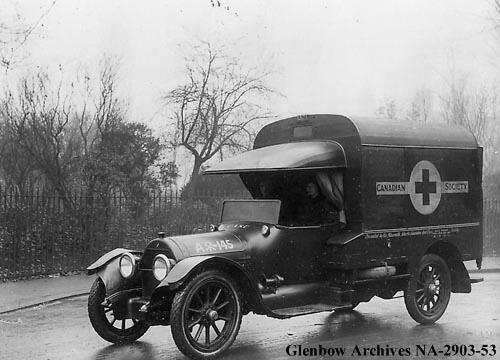 A Cadillac ambulance in front of medical office, Victoria Park barracks, Calgary, Alberta. 1918. Note the wooden windshield framing seen on some home service ambulances. (Glenbow Archives)