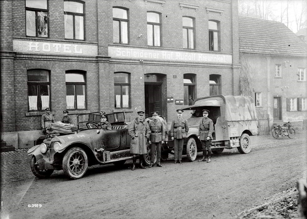 Members of the Canadian Red Cross Committee from London visit the Corps HQ in Schleiden, Germany in December 1918. Note the Red Cross “RC” prefix to the registration number of the hood of the 1916 Cadillac Type 53 and the McLaughlin utility car in the rear, a former ambulance that has had all of its markings painted over with the exception of “Property of Canadian Red Cross” on the body side. (Library and Archives Canada)