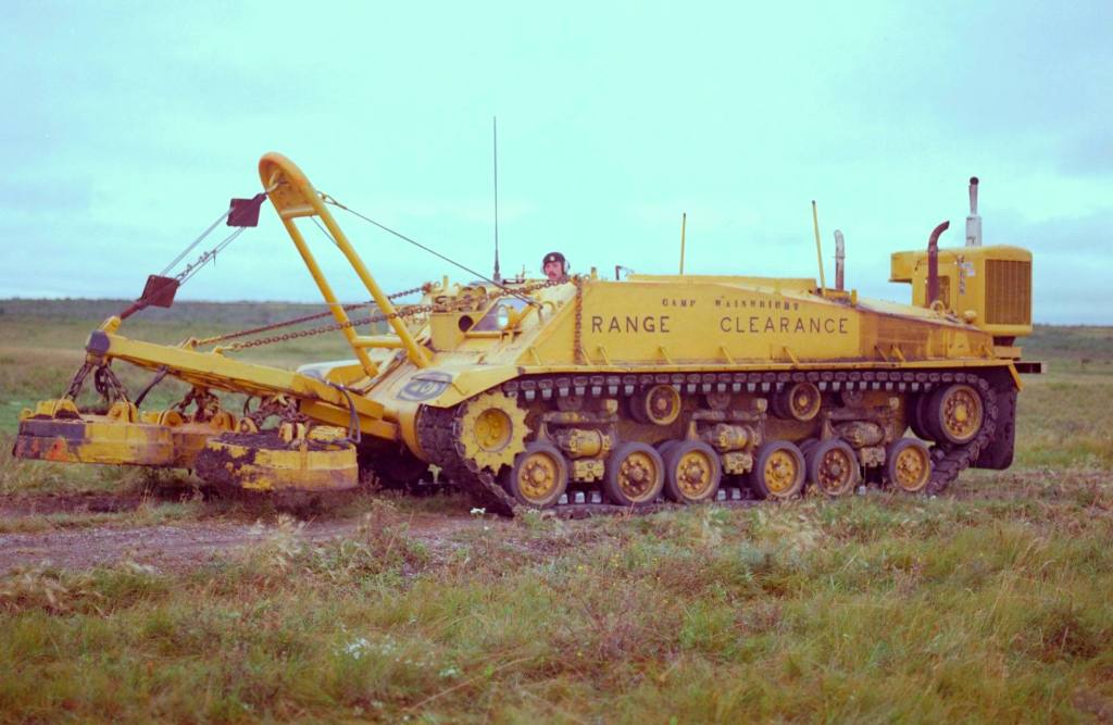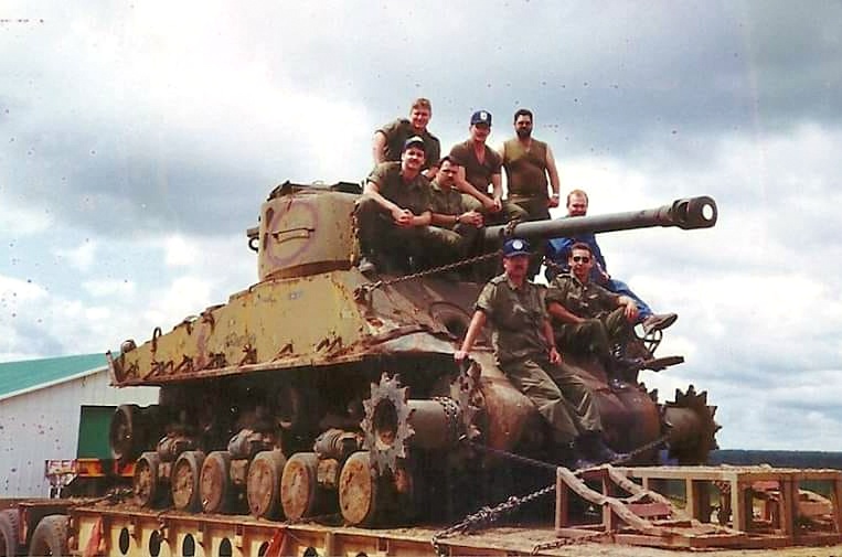 The last Sherman to have the distinction of operational use in the Canadian Forces must go to a turretless tower that was converted by EME at CFB Gagetown. This tank was later painted yellow and used for range clearing by means of three electro-magnets, hung from a tubular frame on the bow plate. It was last used as a tower without magnets, at the Land Engineering and Test Establishment (LETE) in Ottawa in the mid 1990’s before going to the Lord Strathcona’s Horse (RC) to act as a spares source for the operable Sherman maintained by their Historical Vehicle Troop.