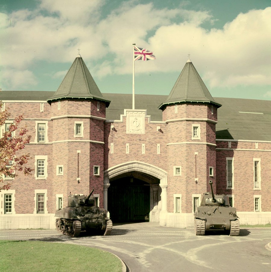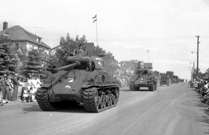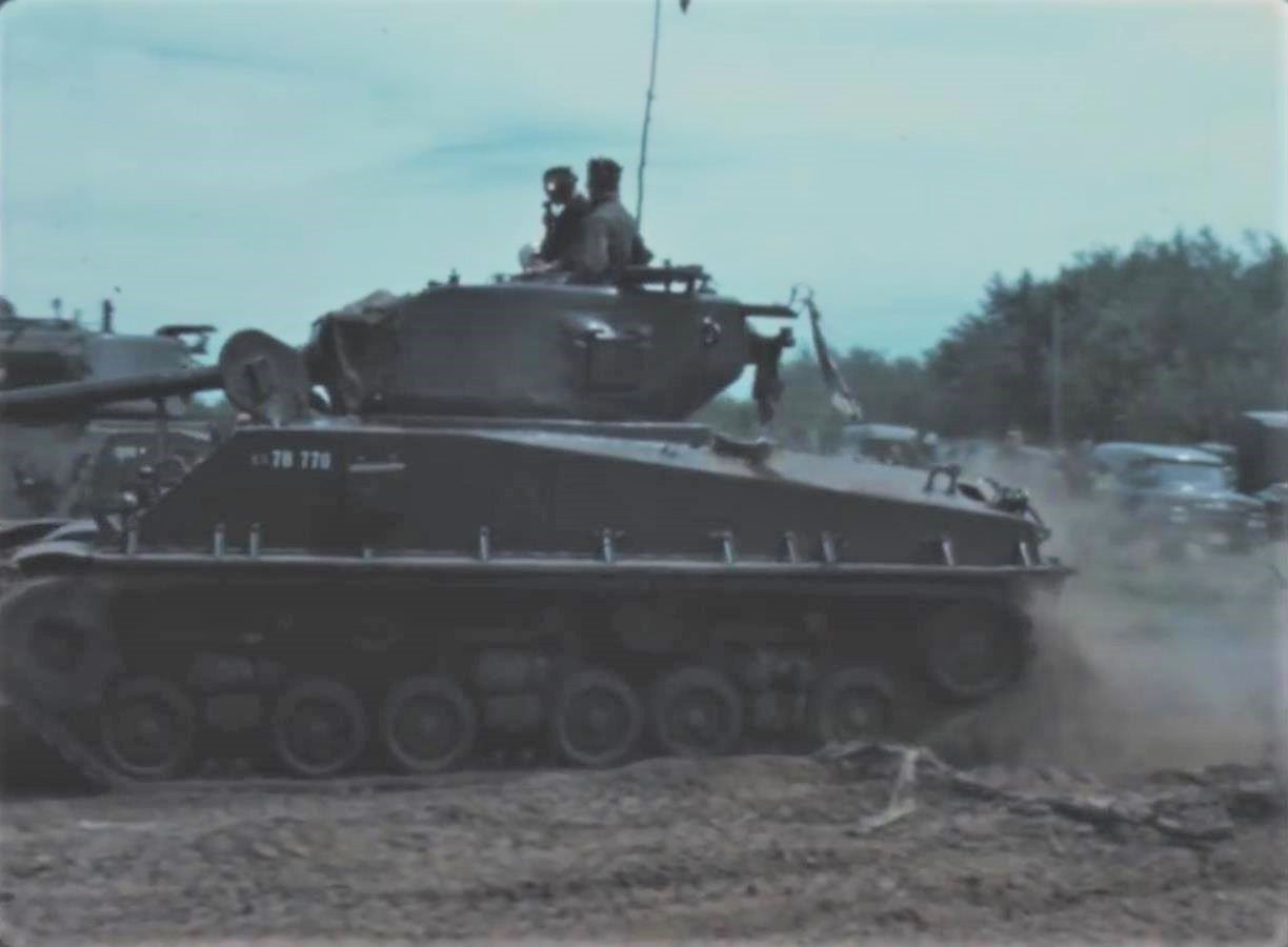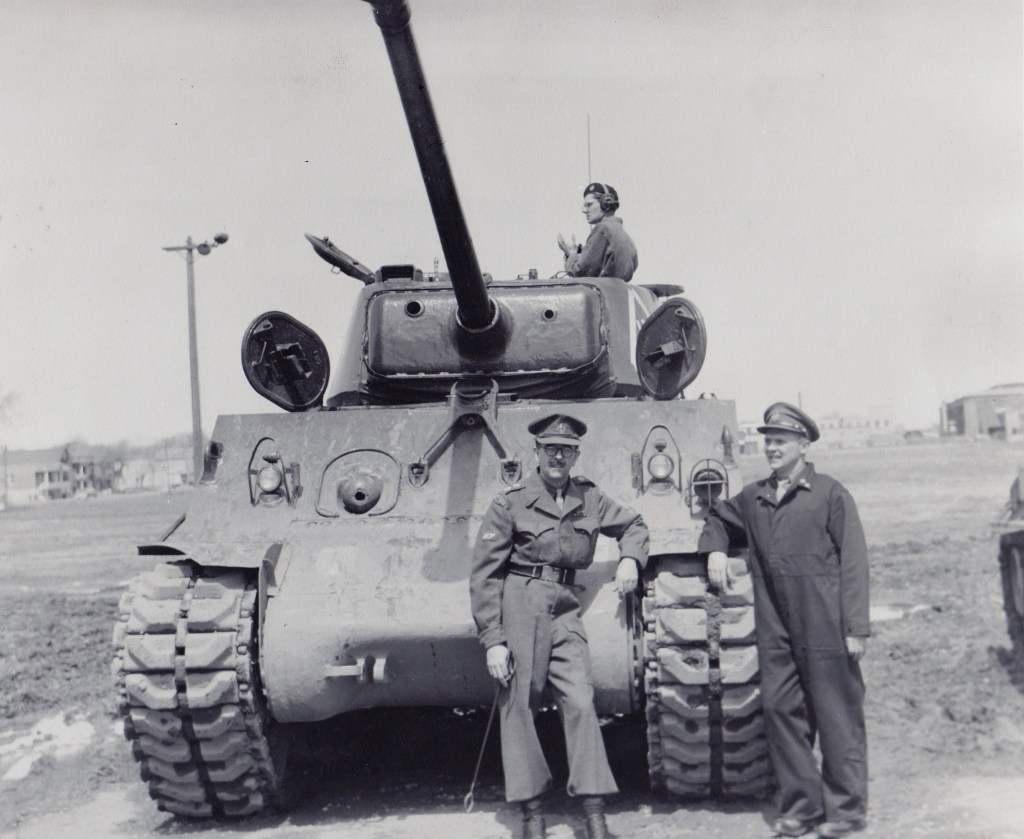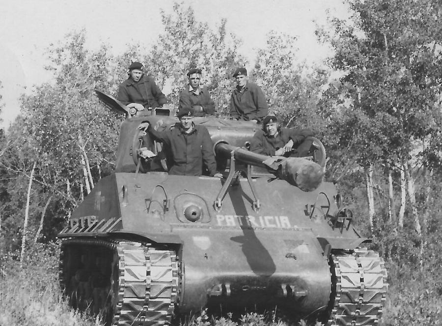 In 1952, the Canadian Army began to receive its new main battle tanks, the British Centurion. These modern tanks were immediately issued to the Canadian Brigade in Germany and the regular force armoured units in Canada. There was a period of cross-over where both Sherman’s and Centurions were used together in training, but by the mid 1950’s the Sherman were predominately used by reserve armoured units. Tanks in use by reserve armored units in this period often have their tracks changed from the steel T66 or T80 designs to the rubber T84. This was primarily due to the need for the reserve units, which had vehicles at their armouries, to parade or transport them on paved public roads. Cities and towns were not keen on having the army tear up their streets.