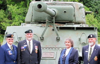 | 65042 | Monument at Sarnia Ontario Legion. “The First Hussars came to Sarnia in 1964, having resumed their role as a reserve armoured reconnaissance training unit. In order to facilitate training, they brought with them a 76 MM cannon and a Sherman tank. The cannon was installed in the basement of the Federal Building. The tank found housing at the Hydro building located at Front and Nelson Streets. The tank had steel tracks which would have destroyed city streets. Senior NCO’s under Sgt. Rick Young changed the tracks to rubber.“ “In 1967, the First Hussars’ responsibilities shifted from armoured artillery training to reconnaissance, and the heavy weaponry became expendable. The Sherman tank, christened “Calamity” to honour Brandy Conron’s D-Day exploits for the “Gallant Hussars,” was offered to Royal Canadian Legion Branch 62. Dedicated three days before Remembrance Day in 1970″ (Sarnia Historical Society) | |